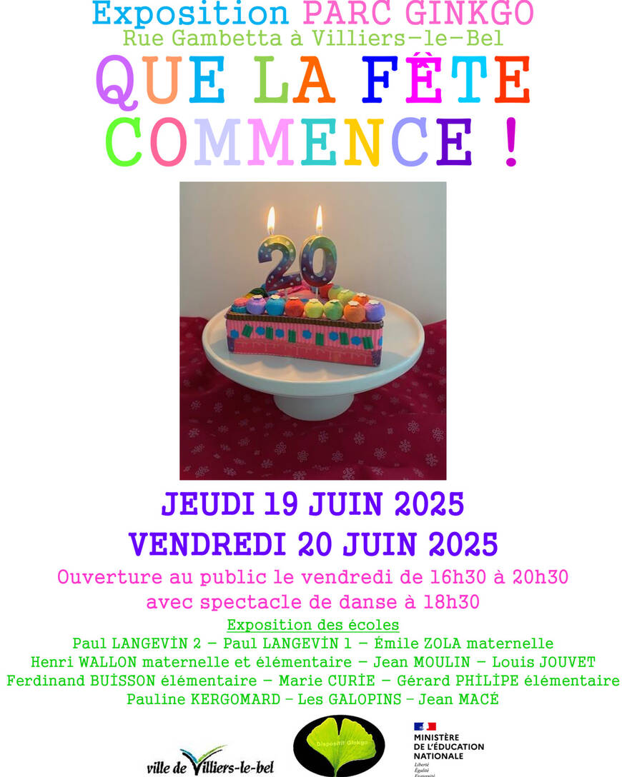 Accès : - rue de Chanzy - rue Gambetta -Cela faut déjà 20 ans que les écoles de Villiers-le-Bel exposent leurs œuvres au parc du Ginkgo ! Cette année encore venez les découvrir vendredi 20 juin 2025, de 16h30 à 20h30, avec un spectacle de danse à 18h30 !