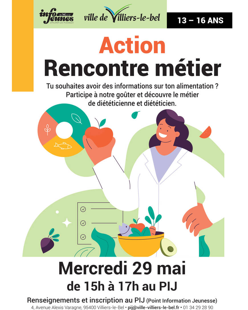 4 avenue Alexis Varagne - 95400 Villiers-le-BelTu as entre 13 et 16 ans et tu souhaites avoir des informations sur ton alimentation ? Participe à notre goûter et découvre le métier de diététicienne et diététicien.