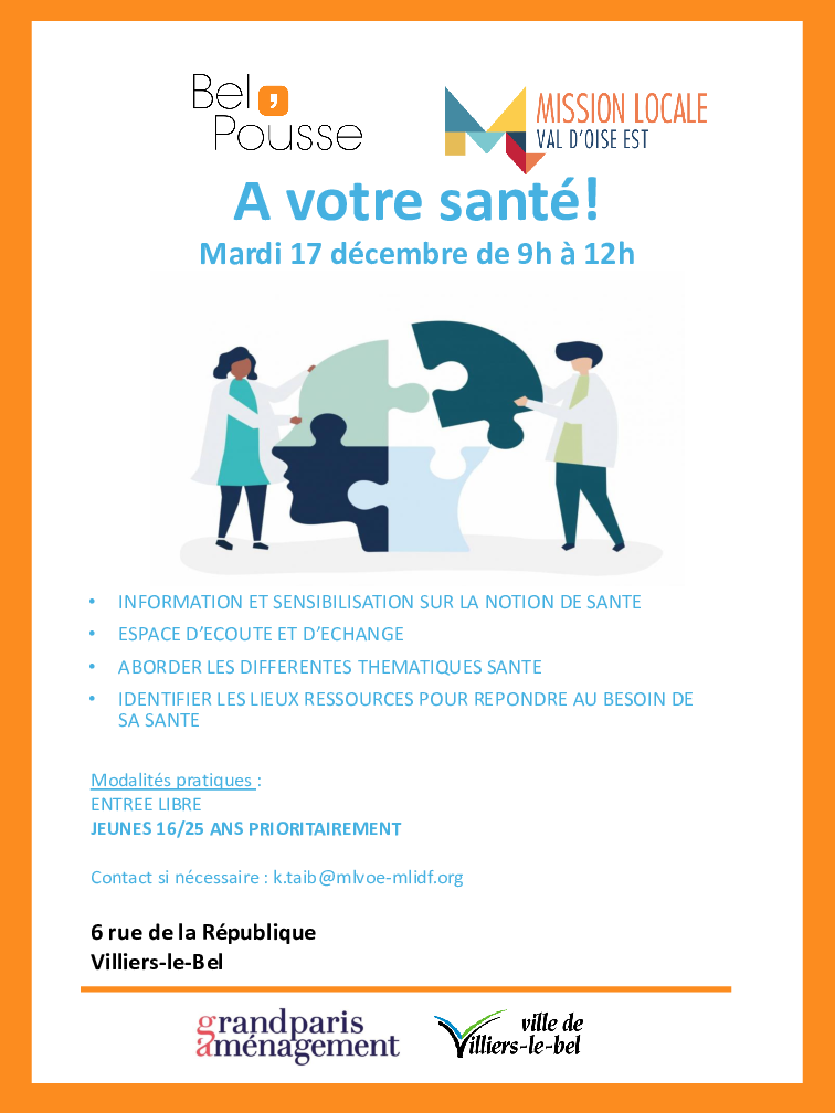 6 rue de la République - 95400 Villiers-le-BelLa Mission Locale accueille les 16-25 ans pour toutes les questions liées à la santé (notamment mentale) pendant cette permanence accessible à tous et gratuite.