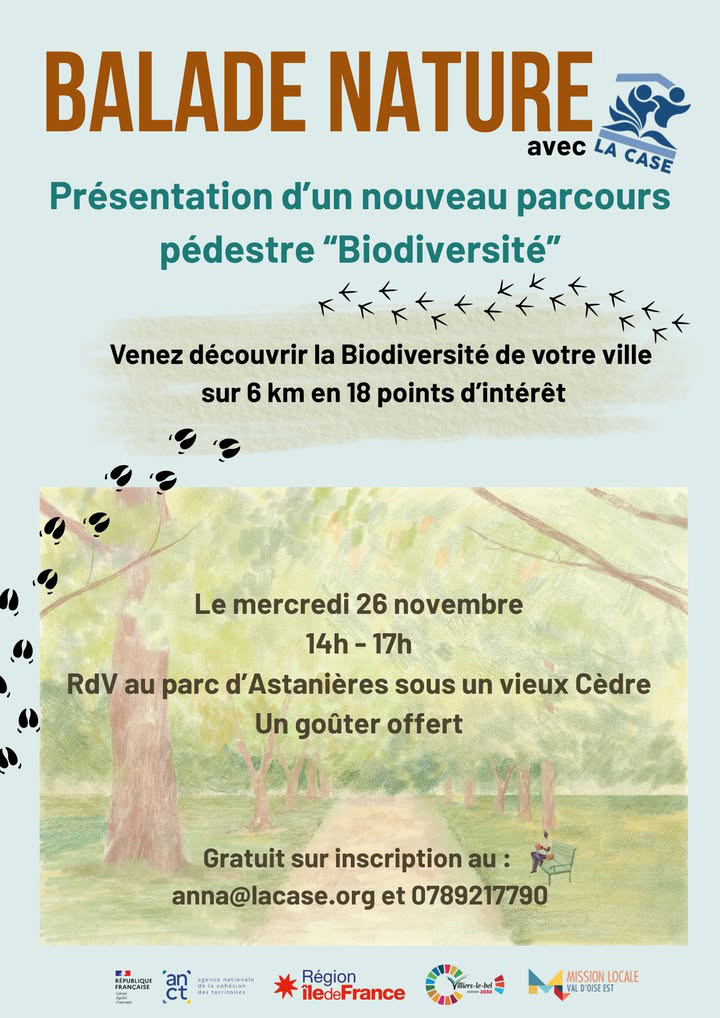 Accès : - rue Julien Boursier - rue du Moulin - rue du Malassis - 95400 Villiers-le-BelA la découverte de l'incroyable diversité du monde vivant qui nous entoure, l'association la Case reprend le cycle des Balades nature dans le cadre d’un partenariat avec la Mission Locale Val d'Oise Est , l’association Soc Girl et la Ville de Villiers-le-Bel.