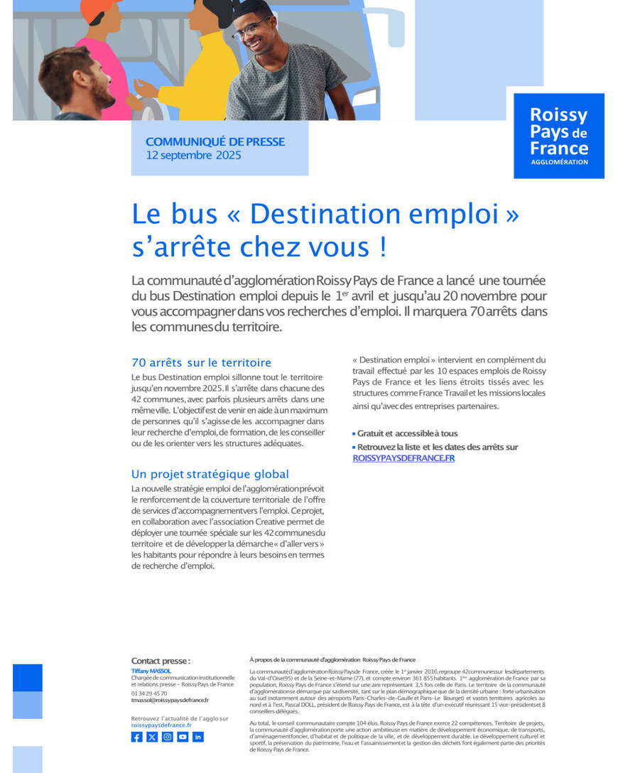 La communauté d’agglomération Roissy Pays de France a lancé une tournée du bus Destination emploi depuis le 1er avril et jusqu’au 20 novembre pour vous accompagner dans vos recherches d’emploi. Il marquera arrêt à Villiers-le-Bel le jeudi 25 septembre de 14h à 17h.