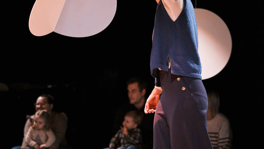Sur scène, un mobile géant danse dans l’espace, des percussions murmurent et des formes en bois attendent d’être explorées. Portés par les notes, les artistes et les enfants inventent ensemble un langage, où la musique et le mouvement donnent vie à un mystérieux « oiseau de lune ».