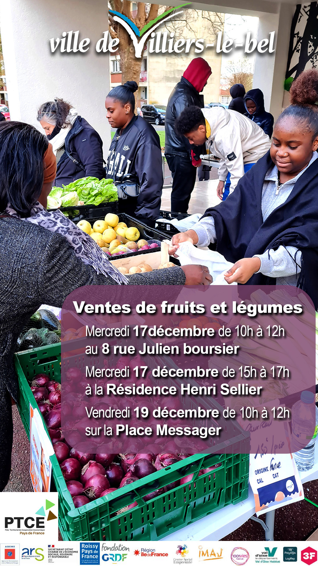 Le PTCE (Pôle Territorial de Coopération Economique) revient à Villiers-le-Bel pour trois ventes de fruits et légumes en ce mois de décembre 2025. Tout doit disparaître pour cette dernière vente de l'année !