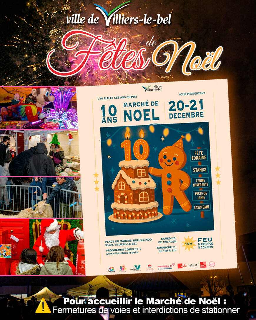 Rue Gounod - 95400 Villiers-le-BelAfin de permettre au Marché de Noël de ravir petits et grands samedi 20 et dimanche 21 décembre 2025, d'installer les stands, la ferme itinérante, la fête foraine, la grande scène de spectacle et le feu d'artifice qui sera tiré samedi à 19h, il est nécessaire de modifier l'usage habituel des lieux.