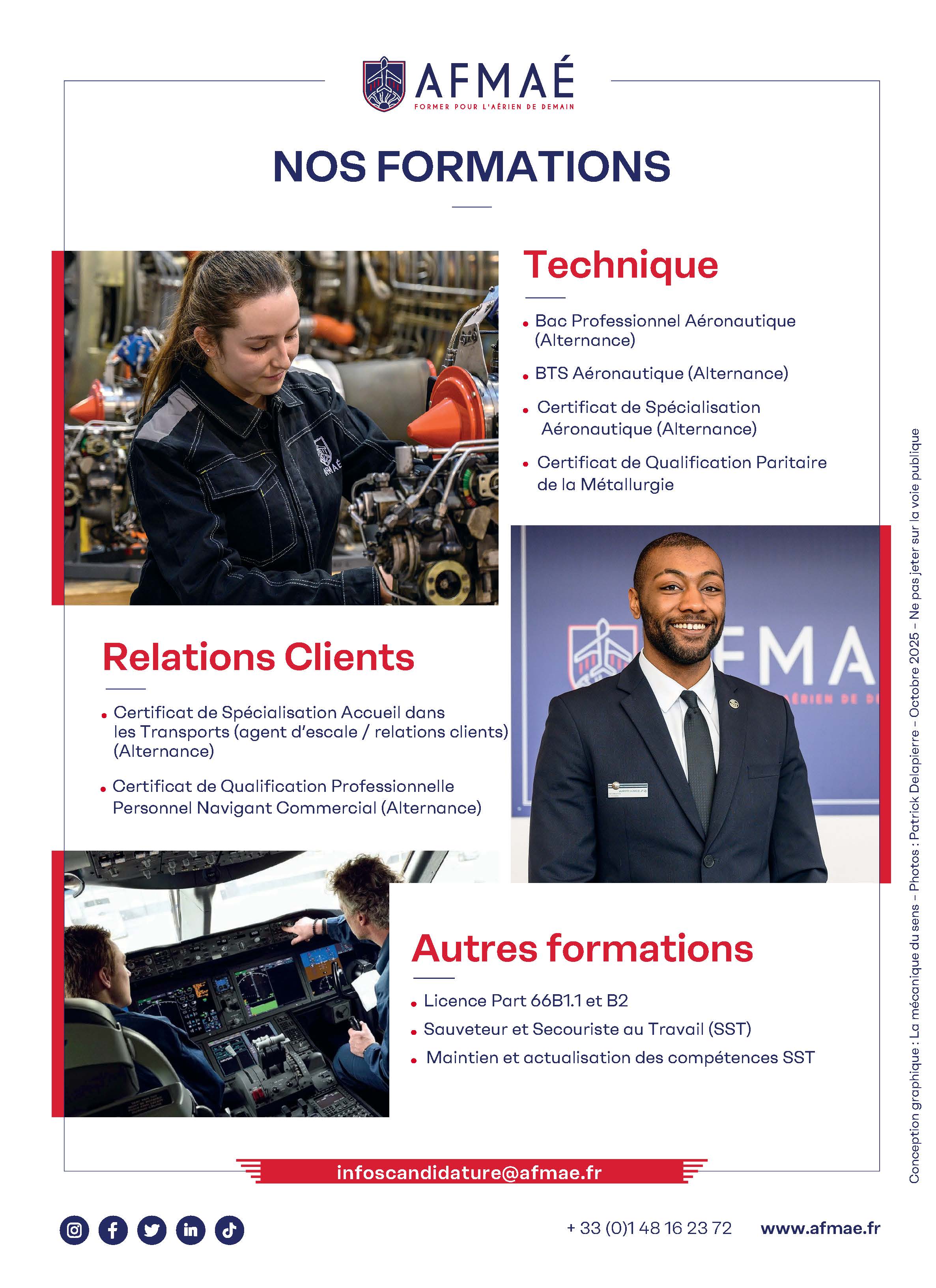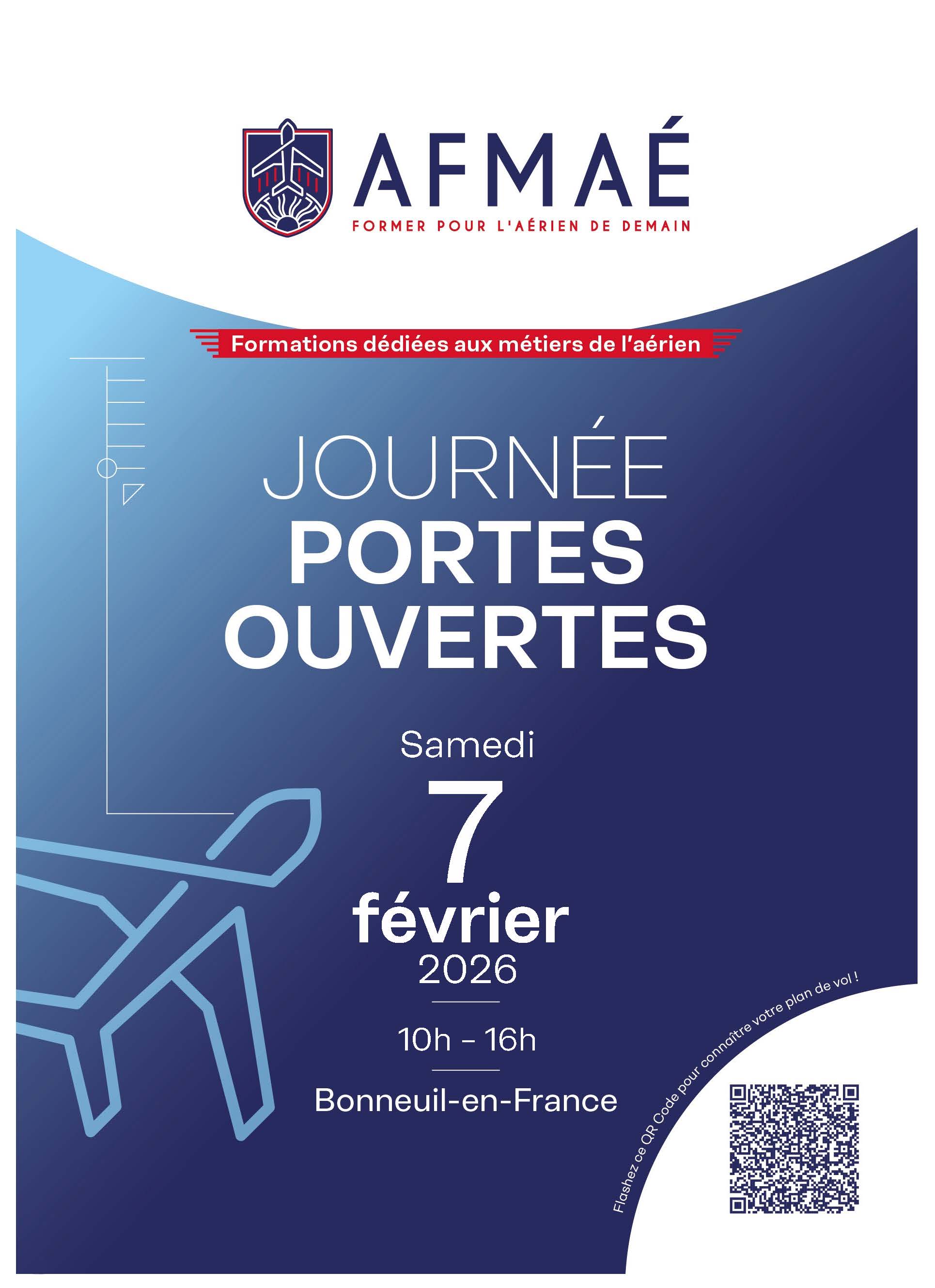 Envie de découvrir les métiers de l’aérien et les formations pour y accéder ? AFMAÉ organise une Journée Portes Ouvertes le samedi 7 février 2026 sur son site de Bonneuil-en-France : visites, échanges, et rencontres avec des entreprises partenaires.