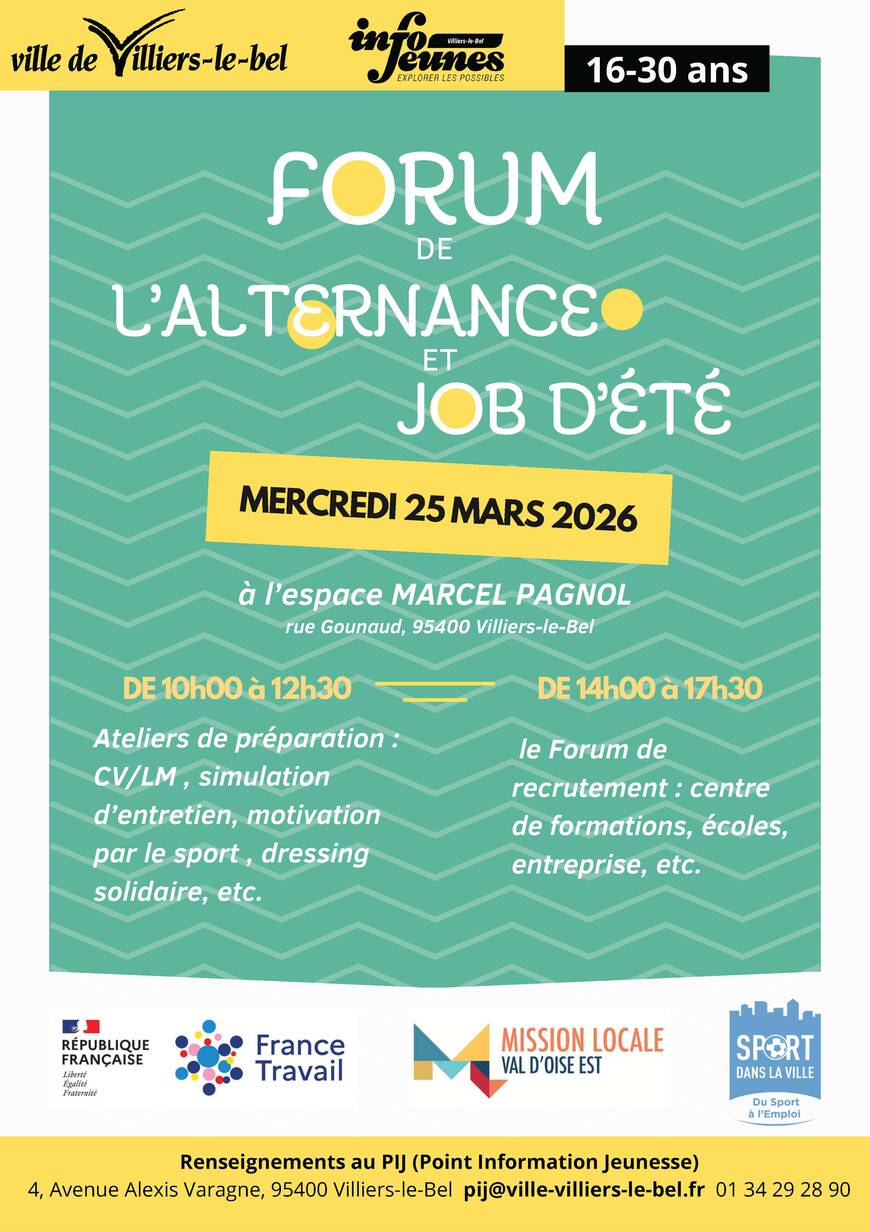 Rue Gounod - 95400 Villiers-le-BelUn cursus en alternance vous tente ? Alors il est temps de monter votre projet, trouver un centre de formation et chercher votre entreprise. Vous cherchez un job d’été ? C’est aussi maintenant qu’il faut commencer à chercher ! Pour vous accompagner dans ces démarches le PIJ (Point Information Jeunesse) de Villiers-le-Bel organise un Forum de l’alternance et des jobs d’été le 25 mars 2026, avec en amont, de février à mars, des ateliers pour vous y préparer activement.