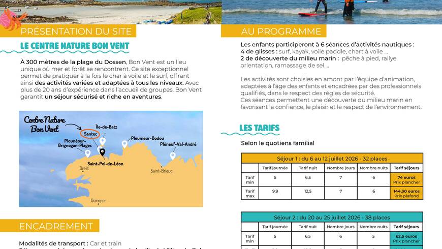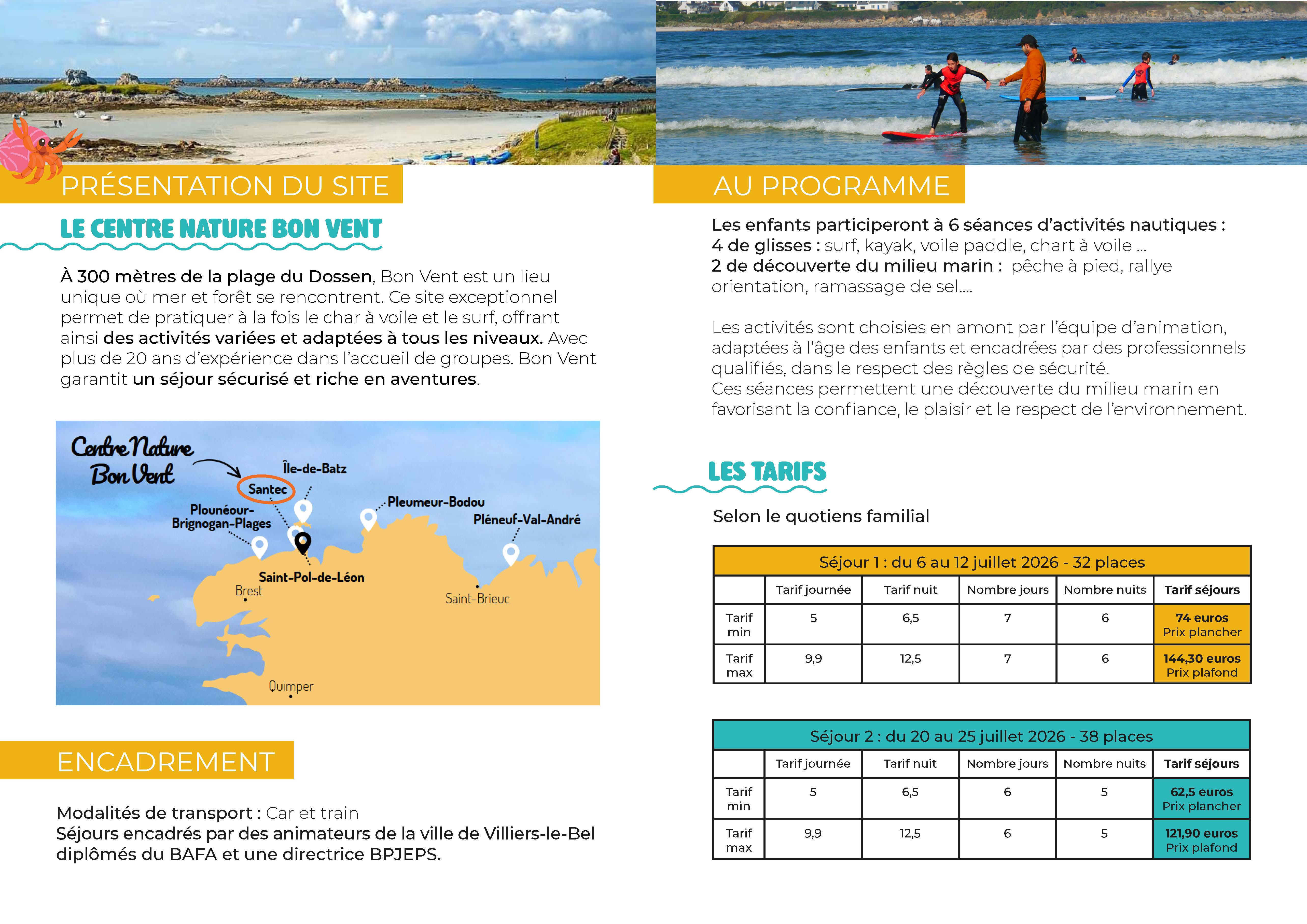 Deux mini-séjours sont organisés par la Ville cet été 2026 pour les enfants beauvillésois âgés de 6 à 11 ans. Surf, kayak, voile paddle, char à voile, c'est un été multi activités que vous propose la Ville, au Centre Nature Bon Vent à Santec !