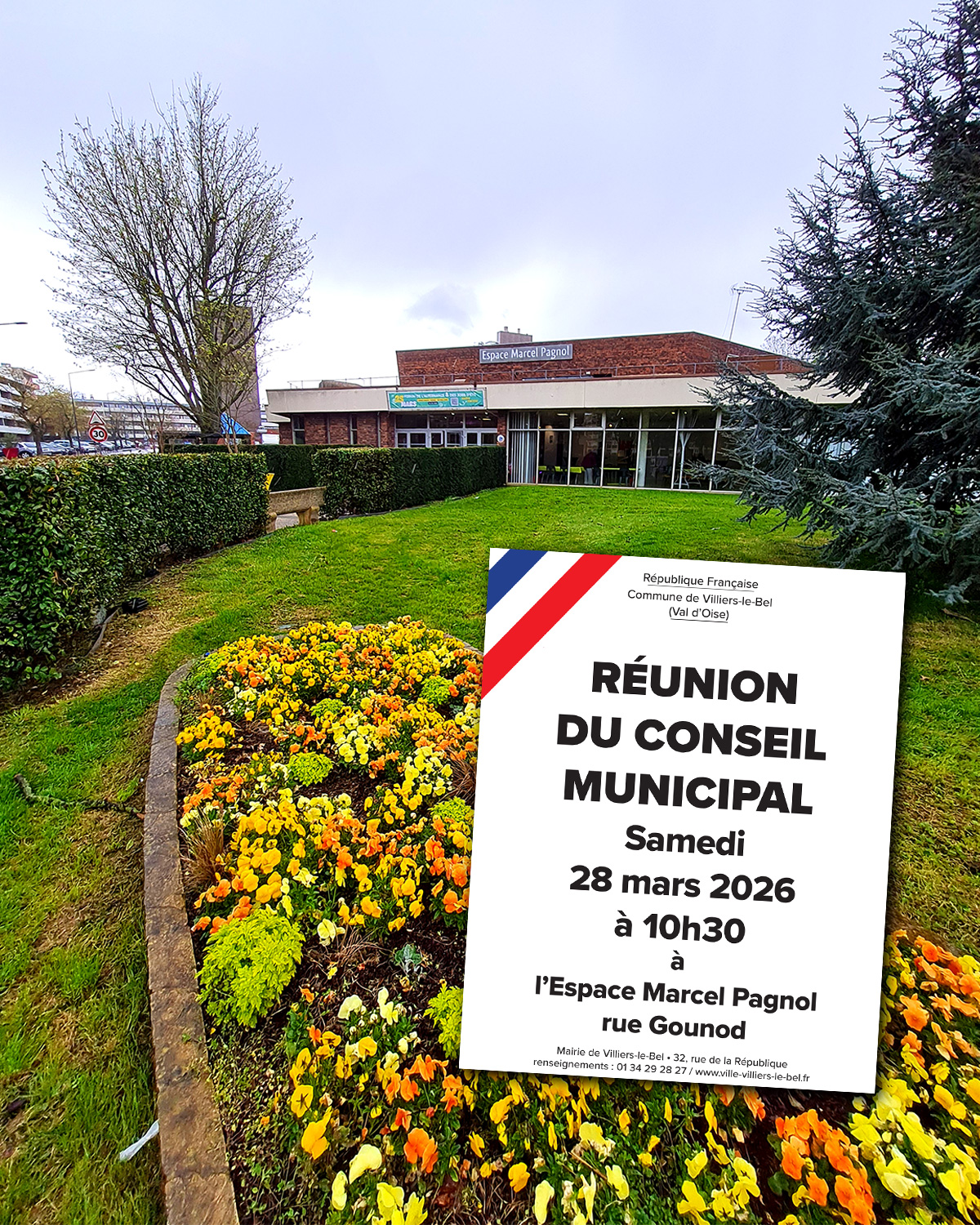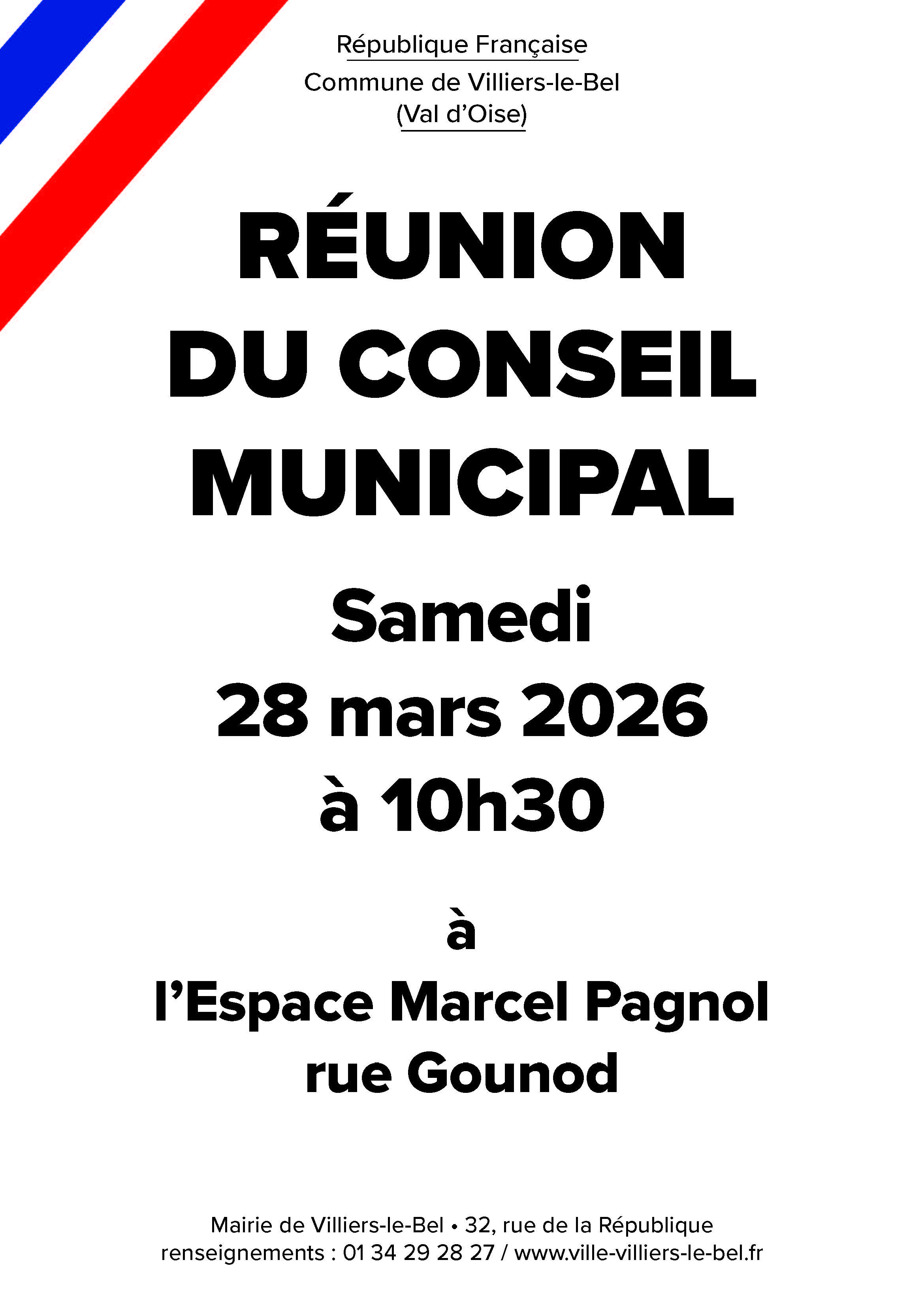 Rue Gounod - 95400 Villiers-le-BelÀ l’issue des élections municipales, le Conseil municipal de Villiers-le-Bel se réunira le samedi 28 mars 2026 à 10h30 à l’Espace Marcel Pagnol pour sa séance d’installation.