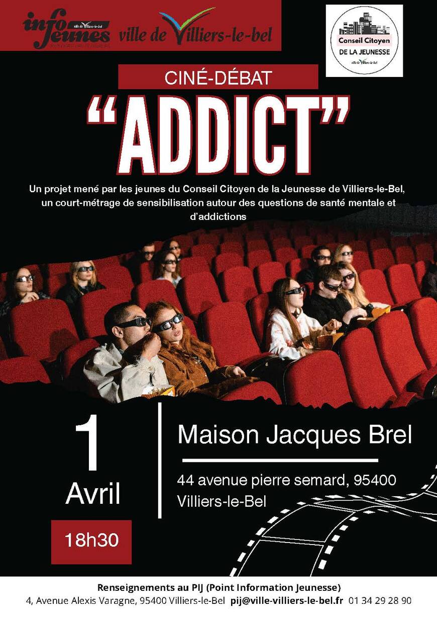 44, avenue Pierre-Sémard - 95400 Villiers-le-Bel La Ville de Villiers-le-Bel et le Conseil Citoyen de la Jeunesse proposent un ciné-débat autour du court-métrage « Addict », un projet de sensibilisation aux questions de santé mentale et d’addictions mené par des jeunes de la commune.
