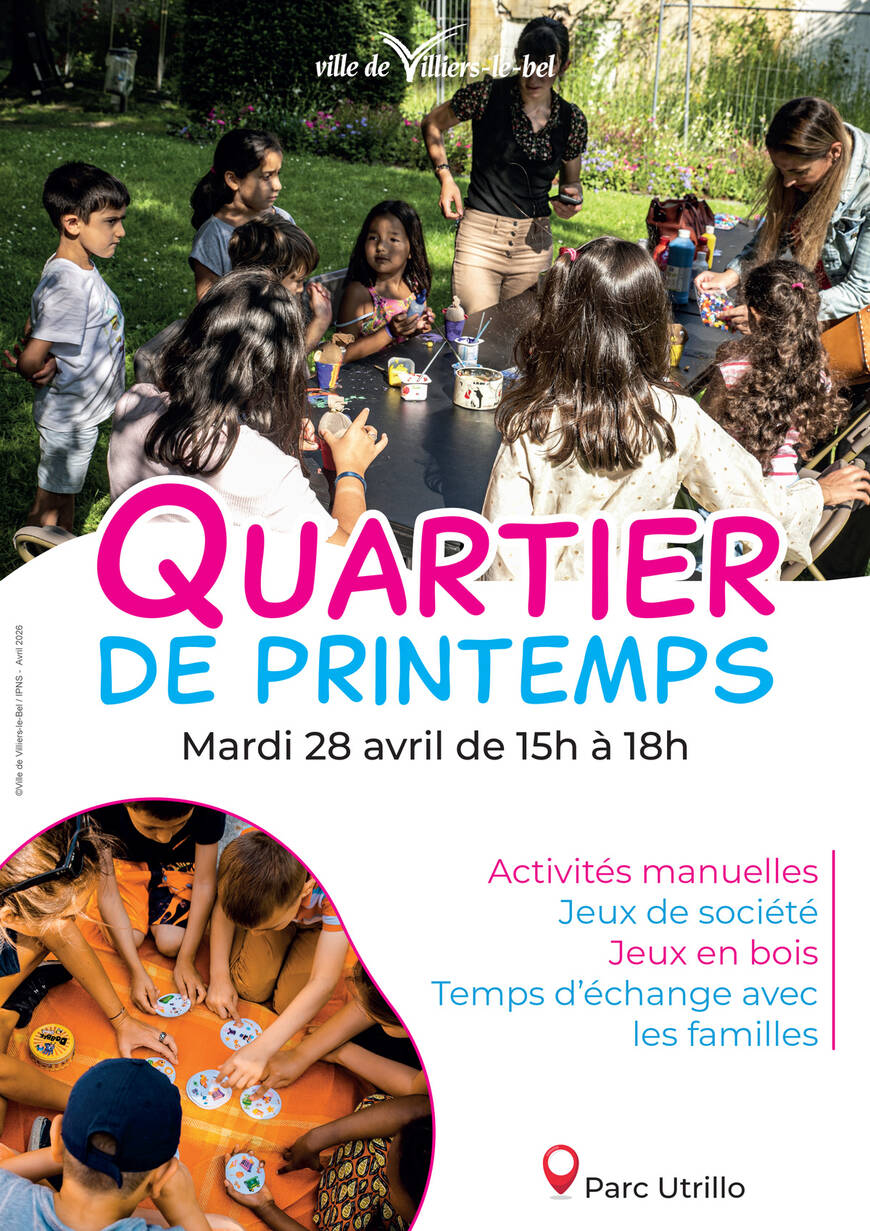 Accès : - avenue du 8 mai 1945 - 95400 Villiers-le-BelLe centre socioculturel Camille Claudel vous invite à un Quartier de printemps ouvert à toutes et tous au Parc Utrillo, au nord du Puits-la-Marlière.