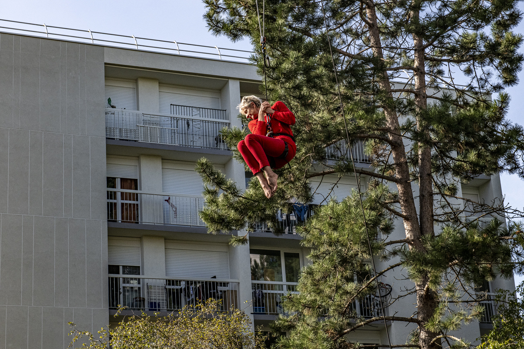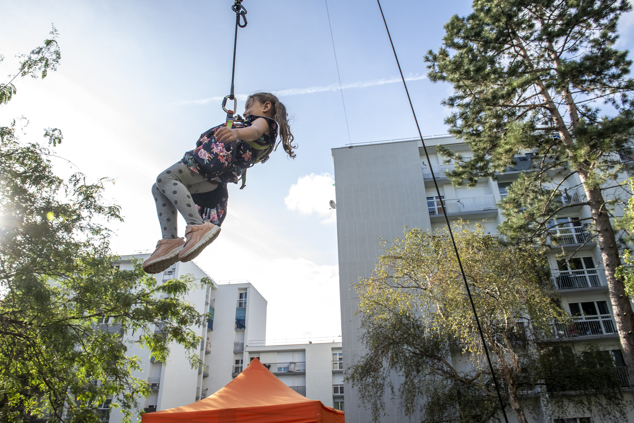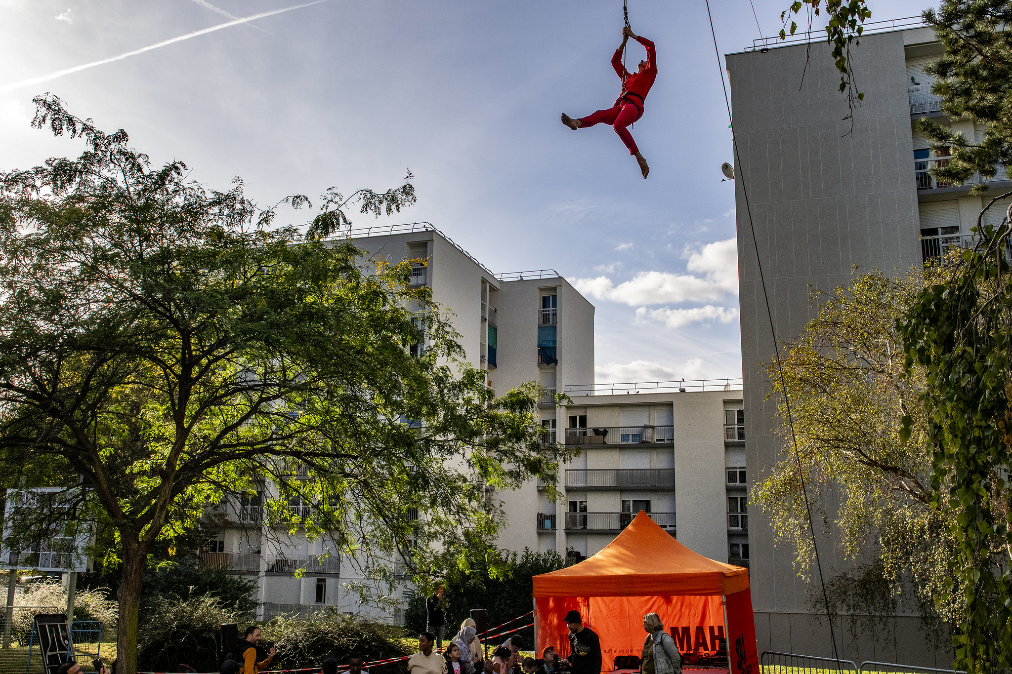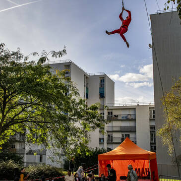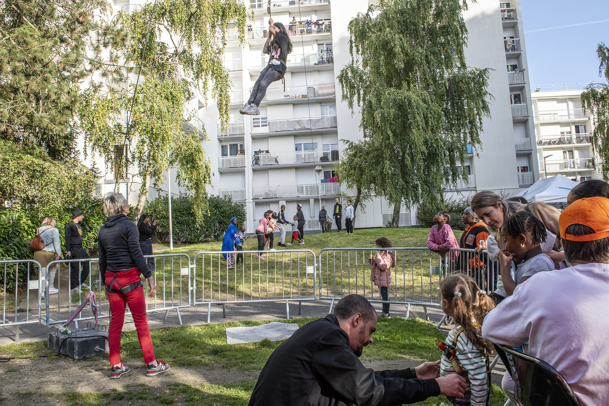 "Tu peux danser avec tes bras ! Avec tes jambes aussi ! Comme si tu flottais dans l'air !" passées quelques secondes d'adaptation, les habitants du quartier de Derrière-les-murs qui ont accepté de se faire hisser au bout d'une corde par des gens de l'assistance, on pu se détendre et flotter dans le ciel de la place de la Traverse. Alors que les tours 3 et 5 place du Bois Joli étaient en train d'être détruite, ce spectacle "Hisse Emoi" proposait de prendre de la hauteur alors qu'au sol on discutait entre autres des projets à venir por le quartier !