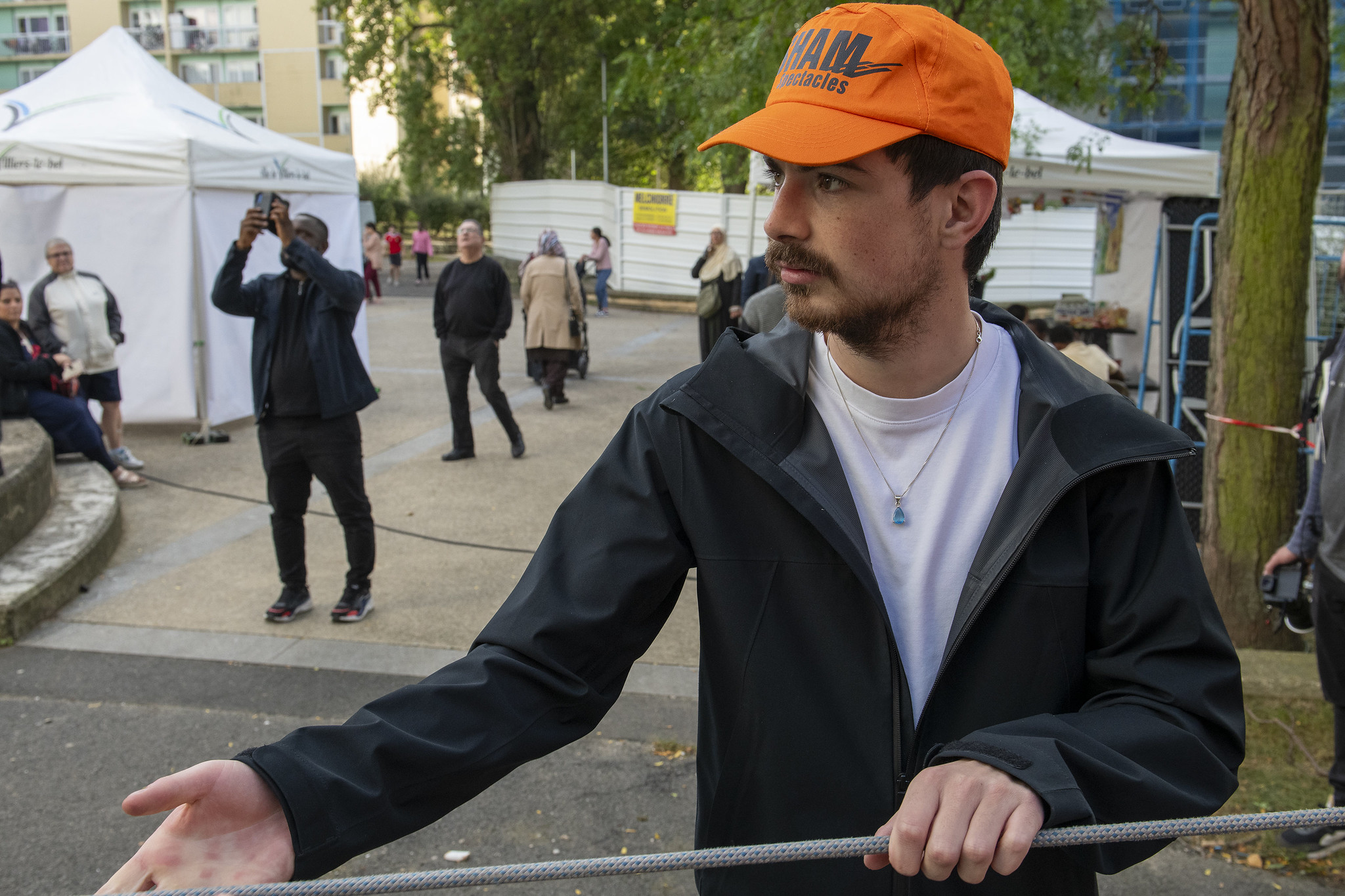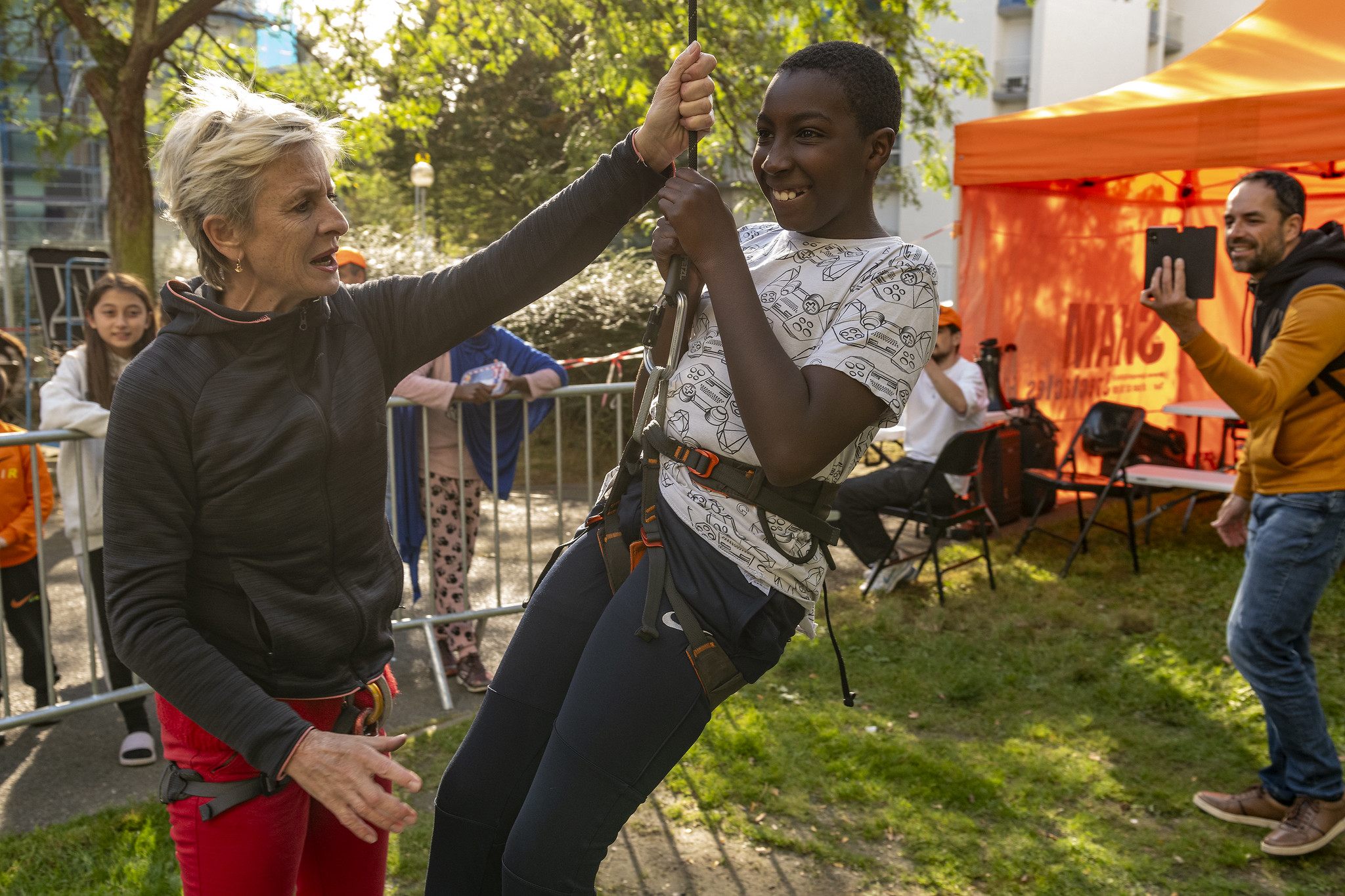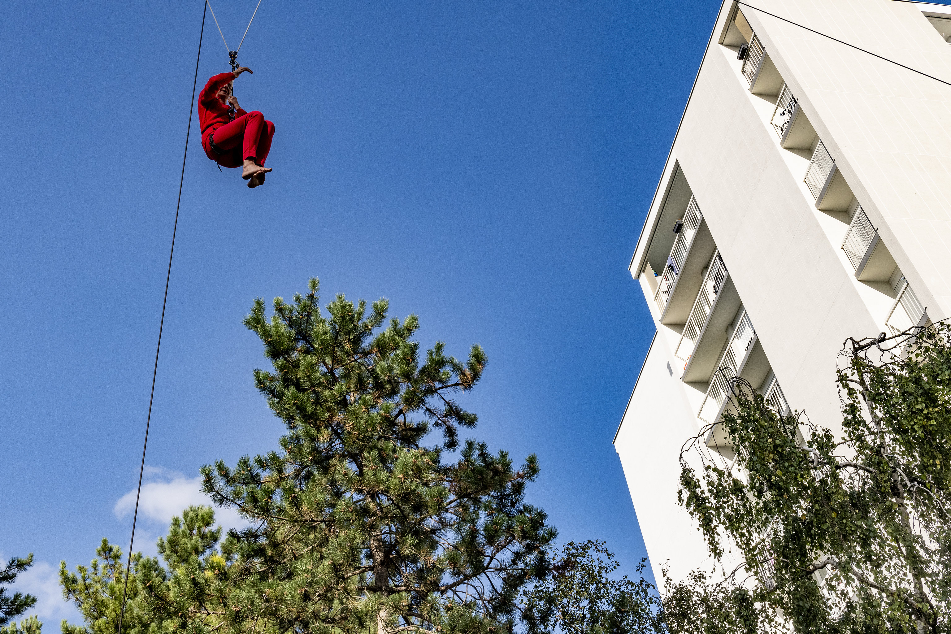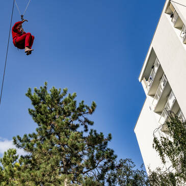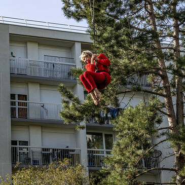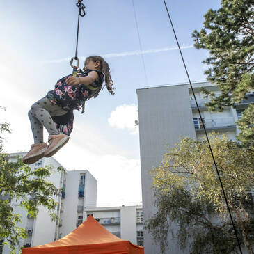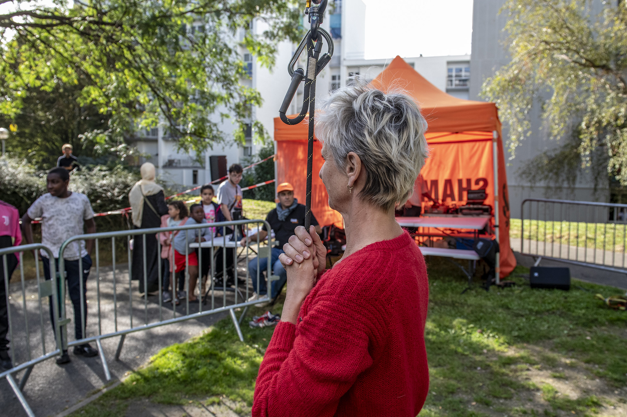 "Tu peux danser avec tes bras ! Avec tes jambes aussi ! Comme si tu flottais dans l'air !" passées quelques secondes d'adaptation, les habitants du quartier de Derrière-les-murs qui ont accepté de se faire hisser au bout d'une corde par des gens de l'assistance, on pu se détendre et flotter dans le ciel de la place de la Traverse. Alors que les tours 3 et 5 place du Bois Joli étaient en train d'être détruite, ce spectacle "Hisse Emoi" proposait de prendre de la hauteur alors qu'au sol on discutait entre autres des projets à venir por le quartier !